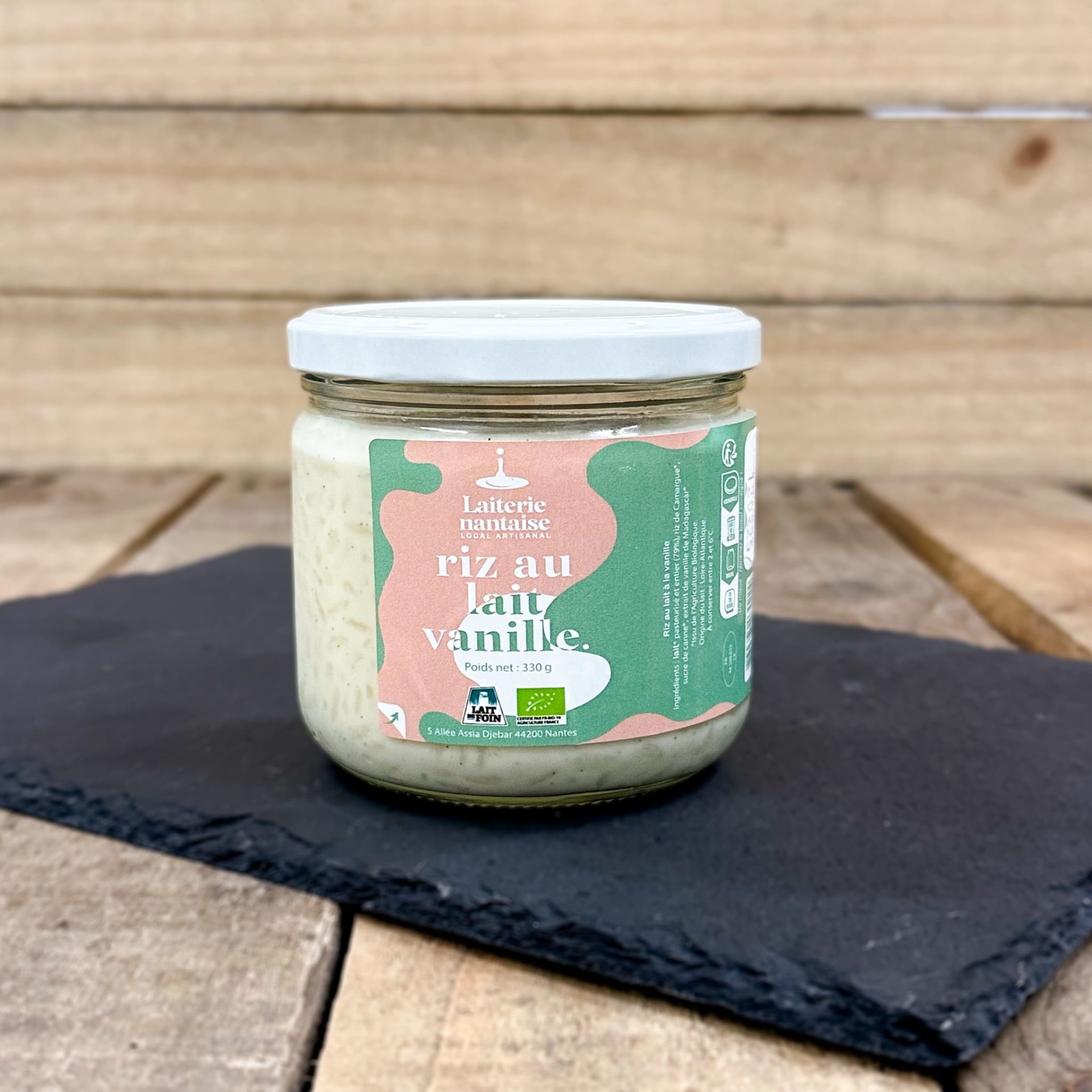 Ingrédients : lait pasteurisé et entier* (79%), riz de Camargue*, sucre de canne*, extrait de vanille de Madagascar*