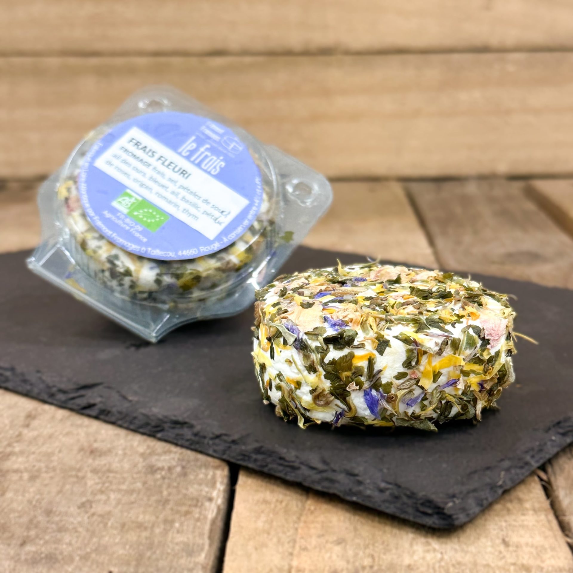 Ingrédient : fromage frais, sel, pétales de souci, ail, ail des ours, bleuet, ail, basilic, pétales de roses, origan, romarin, thym