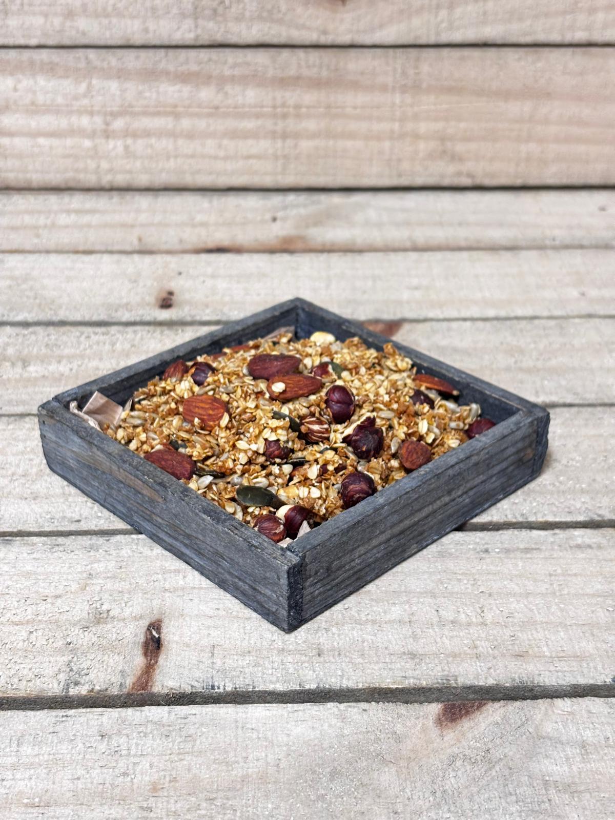 Ingrédients : Flocons d'avoine, graines de courge, noisettes entières, graines de tournesol, huile d'olive, miel, sucre roux, amandes entières et fleur de sel.